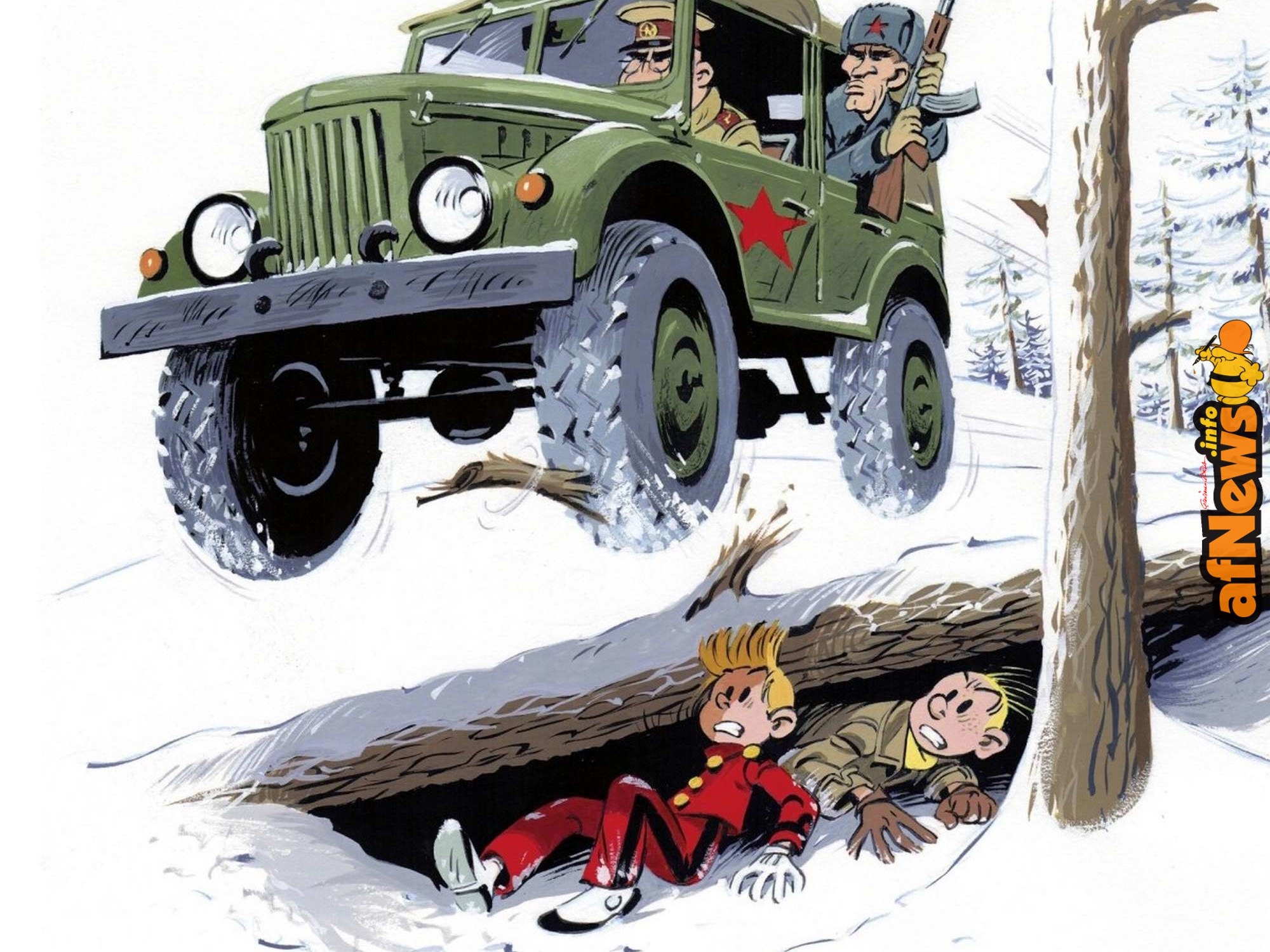 SPIЯOU chez les Soviets, è la nuova avventura della storica serie. Questa settimana, su Spirou 4249, c’è il primo episodio. Dopo cinque anni di lavoro, il compagno Fabrice Tarrin, disegnatore, accompagnato dal compagno Fred Neidhart, sceneggiatore, offrono ai giovani lettori una superba avventura comica ambientata al tempo della Guerra Fredda: Un’invenzione rivoluzionaria del Conte di Champignac è oggetto della brama del KGB (il servizio segreto del regime sovietico)… Due spie arrivano a Champignac… Uhm…