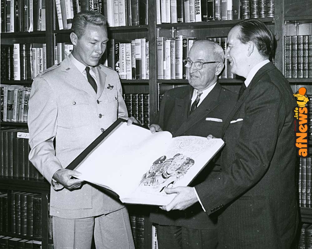 Cartoonist Milton Caniff with President Truman & Dean Fredericks, the actor who played Steve Canyon on tv. pic.twitter.com/OcLcQ9isz9