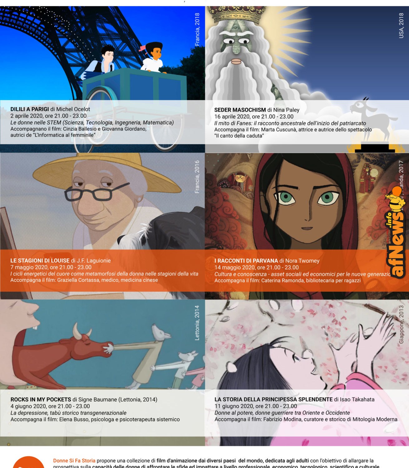 Dal 2 aprile, in collaborazione con Ambrosio Cinecafè di Torino, il progetto Donne Si Fa Storia (DSFS) lancia il primo ciclo della rassegna “ANIME – sei film d’animazione per allargare l’inquadratura ad un racconto anche al femminile”: una collezione di film d’autore dai diversi paesi del mondo, dedicata agli adulti.