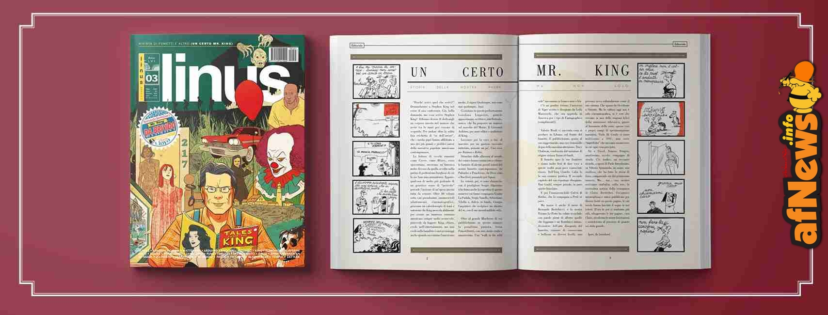 Bella sorpresa della rivista Linus che nel numero di Marzo 2020, arrivato in questi giorni in edicola, propone una bella cover originale firmata dal disegnatore e sceneggiatore ( e noto colorista) Sergio Algozzino ( Memorie a 8bit, Myrna e il Tocco della Morte. Nellie Bly ) dedicata al genio creativo di Stephen King, autore di veri classici quali “Shining”, “It” e “Carrie”, ed il trentennale ciclo della Torre Nera, che hanno variamente influenzato la letteratura, la cinematogarafia ed il mondo del fumetto, a cui la rivista diretta da Igort, dedica il consueto focus di approfondimento.