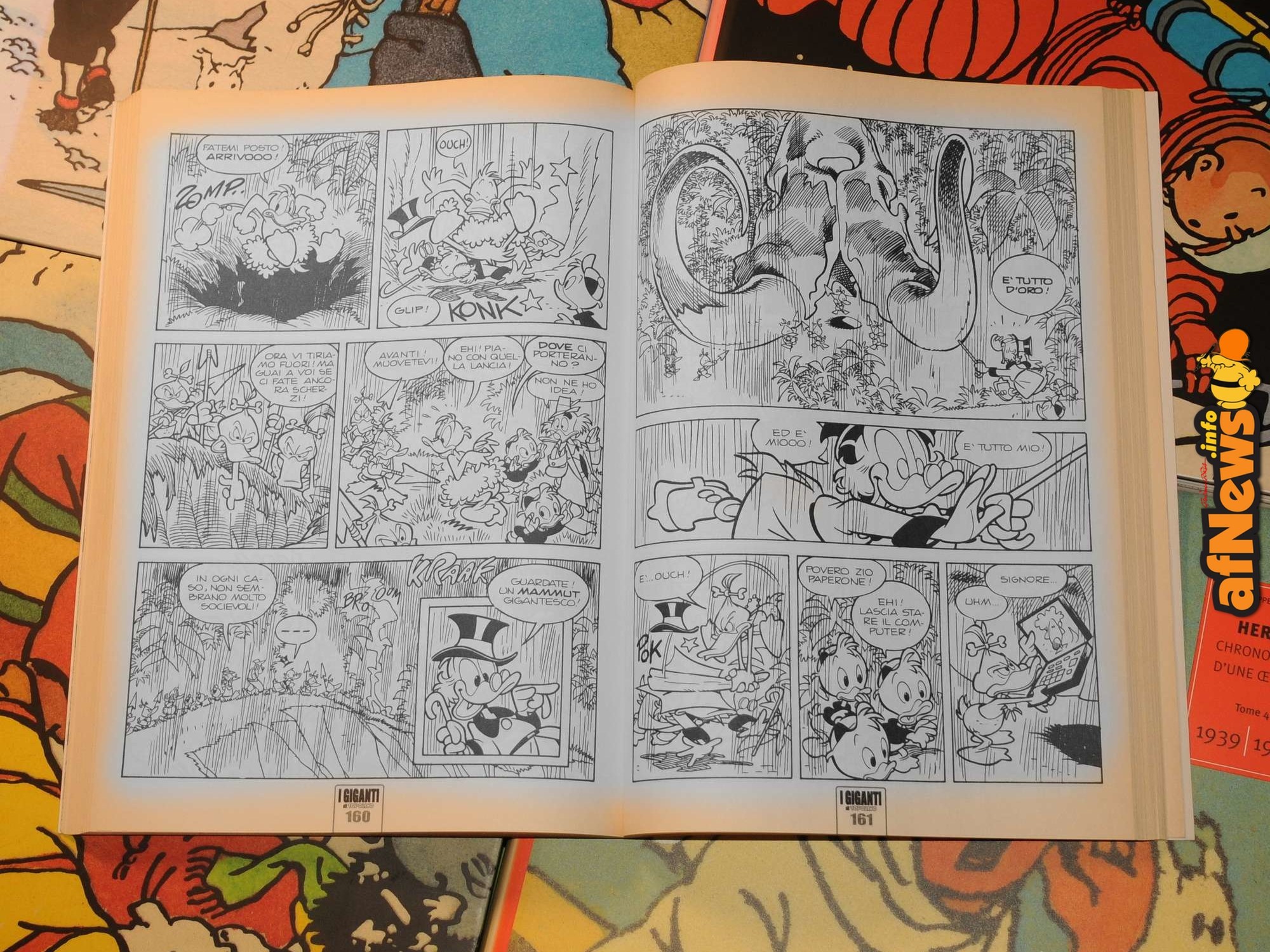Le pagine che ho scannerizzato sono state disegnate da Massimo De Vita, Romano Scarpa, Giorgio Cavazzano e Andrea Ferraris. Mica male, eh? Sono tratte da primo volume della serie I Giganti di Topolino (luglio-agosto 2005), che proponeva, nel formato A4 (21×29.7, quello dei fogli che si usano nella stampante), delle belle storie in bianco e nero! Fu un bel regalo, visto che da decenni non uscivano storia che non fossero già colorate. Ne uscirono 6 volumi (io ho solo il primo), stampati su carta porosa e non abbastanza spessa, che ora si trovano nell’antiquariato, diciamo così.